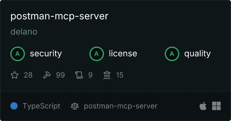 Postman MCP Server is a TypeScript-based MCP server that integrates with the Postman API, providing comprehensive management of Postman collections, environments, and APIs.